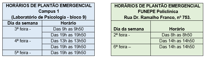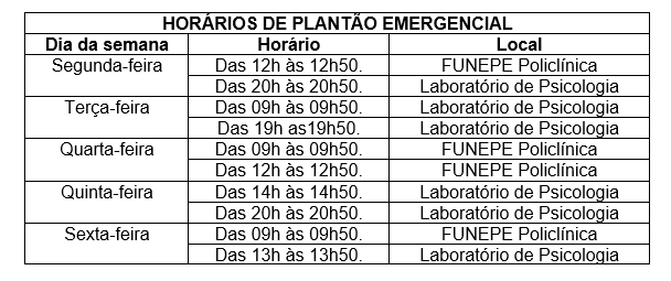 Outra modalidade de atendimento, destinada a casos de urgência, é o Plantão Emergencial, conforme cronograma. Nessa modalidade, basta dirigir-se diretamente ao local do plantão, nos dias e horários indicados, onde uma psicóloga estará à disposição para atendê-lo. O acolhimento será realizado e, havendo necessidade, o interessado será encaminhado para outro serviço do IACE.