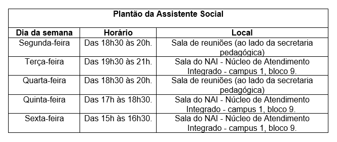 A assistente social atende na FUNEPE – Campus I, de segunda a sexta-feira. Dentre outras atividades, realiza plantões para atendimento aos estudantes, em horários específicos. Caso necessite, basta procurá-la.