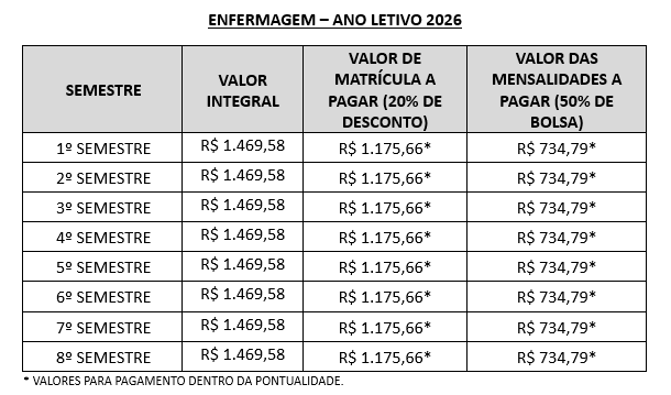 Acervo em biblioteca virtual, com milhares de títulos disponíveis; laboratórios básicos de saúde, laboratórios especializados de Enfermagem e de Informática; Aulas com metodologias inovadoras e ativas; estágios na rede pública; grupos de pesquisa, com incentivo institucional; programas de monitoria acadêmica; eventos científicos.
