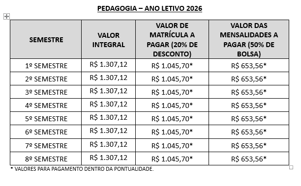 ANUIDADES PARA O ANO LETIVO DE 2026